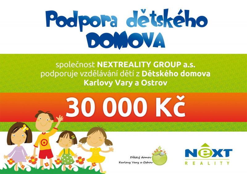 Next Reality Group a.s. nezapomíná ani na dobročinné a charitativní akce, které se staly pravidelnou součástí jejích aktivit. Jako příklad může sloužit karlovarská pobočka, která v červnu minulého roku odstartovala svůj regionální projekt „Podpora dětského domova“ a jako první v České republice pravidelně finančně podporuje dětský domov Karlovy Vary a Ostrov. „Projekt jsme si vymysleli sami při jednom odpoledním posezení. Pomoc dětem se pro nás stala srdcovou záležitostí a interní soutěží zároveň. Makléři se předháněli celé léto, kdo z nich nasbírá pro domov nejvíc finančních prostředků,“ uvedl vedoucí regionální pobočky Miroslav Podivín. Zatím poslední finanční dar ve výši 23 000 Kč předali makléři společně s vedením pobočky v úterý 28. února v Mezirolí. Jako symbolika daru byla opět zlatá cihla. Příspěvek bude využit na rekonstrukci domu, který patří dětskému domovu a nachází se právě v Mezirolí. Rekonstrukce se týká druhé samostatné části domu, kde vzniká bydlení pro druhou pěstounskou rodinu s šesti dětmi. Pobočka v Karlových Varech už má také dopředu promyšlené, kam poputuje jejich další finanční příspěvek. Máme v plánu podpořit doplňkové vzdělávání dětí (jazykové kurzy a rekvalifikační kurzy pro starší děti). Předání příspěvku se bude konat koncem června letošního roku.